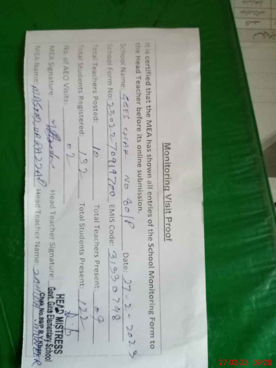 | Attendance Register | Head Teacher | MEA with School | Visit Proof |