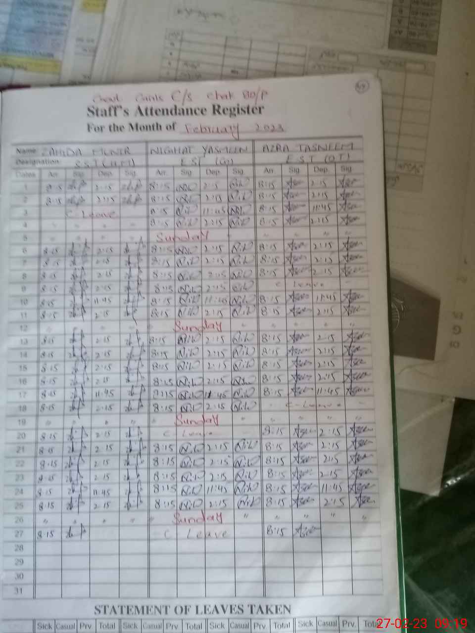 | CNIC | Full Name | Designation | R/C | Absence During Last Calender Month |