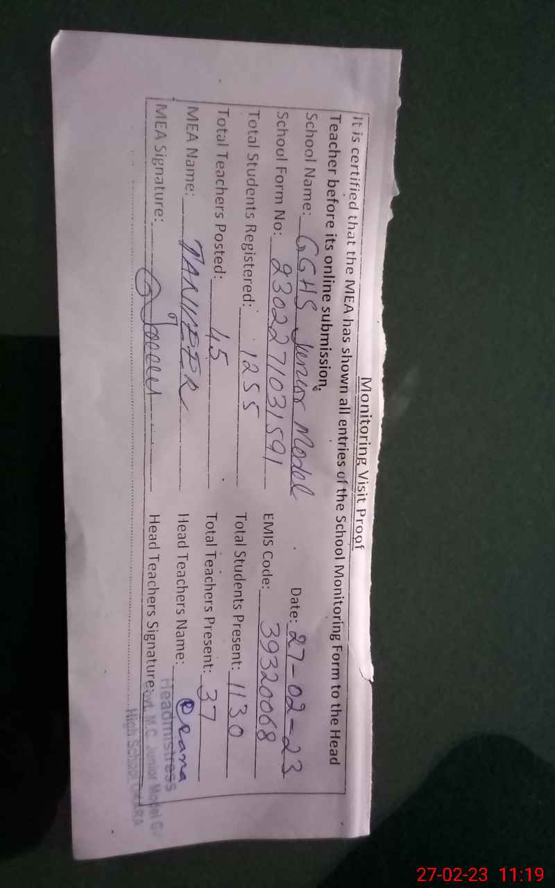 | EMIS Code: 39320068 | Name of School: GGHS MC JUNIOR MODEL OKARA | |||