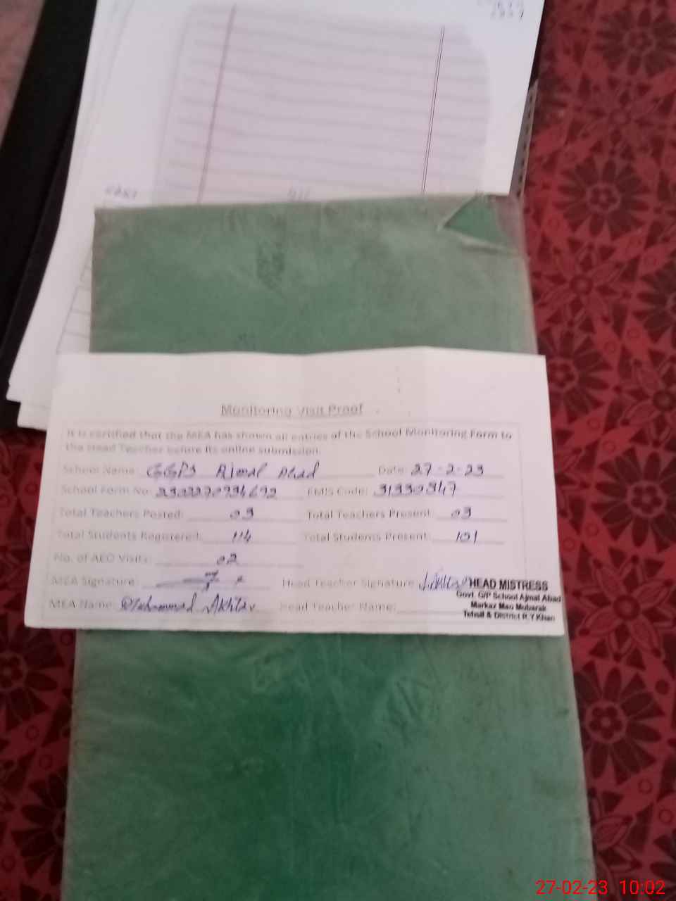 | Attendance Register | Head Teacher | MEA with School | Visit Proof |
