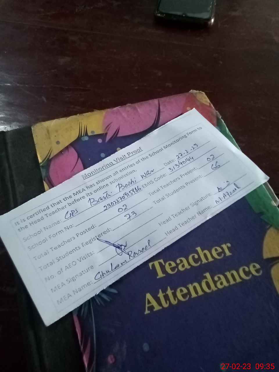 | Attendance Register | Head Teacher | MEA with School | Visit Proof |