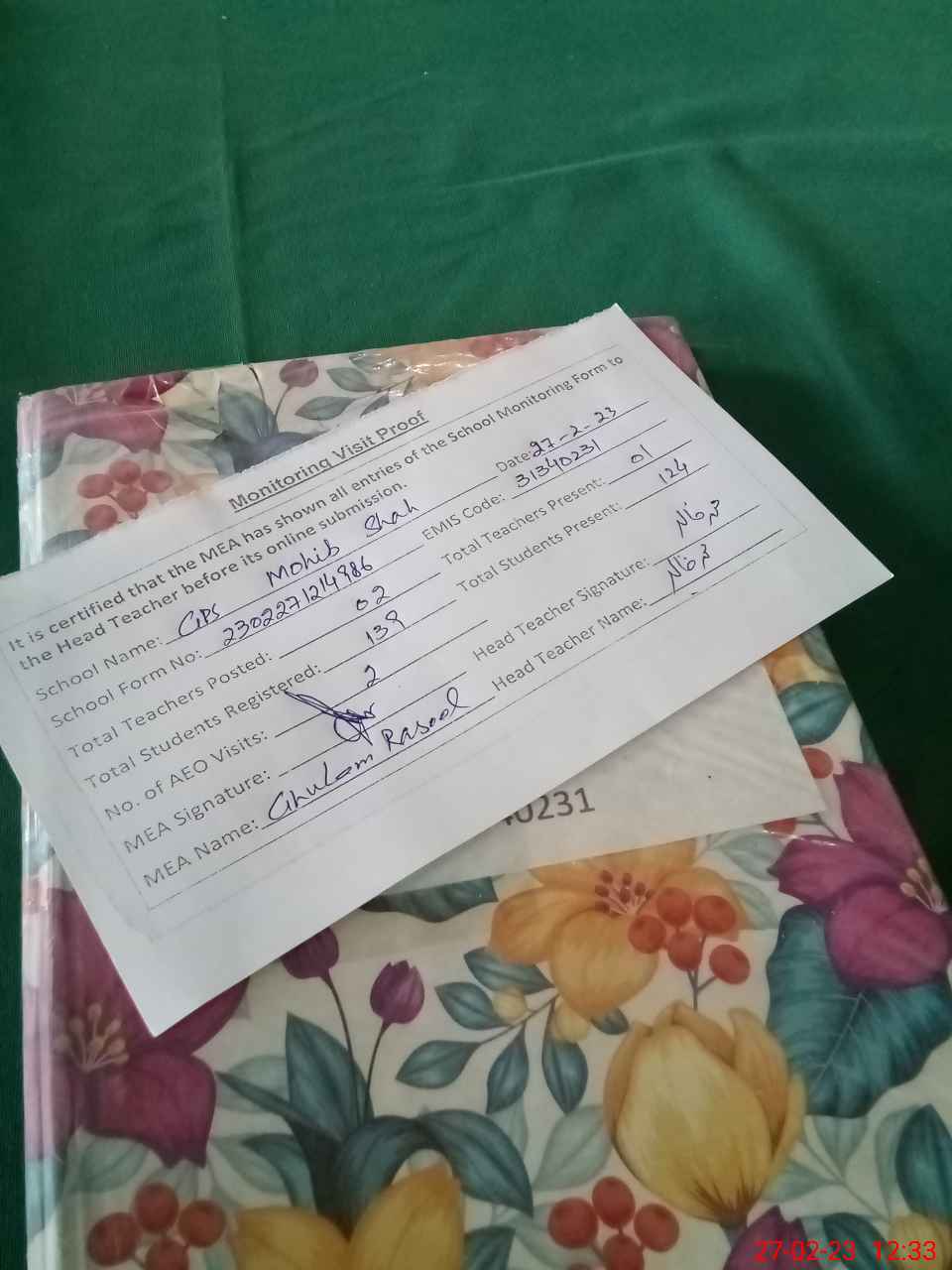 | Attendance Register | Head Teacher | MEA with School | Visit Proof |