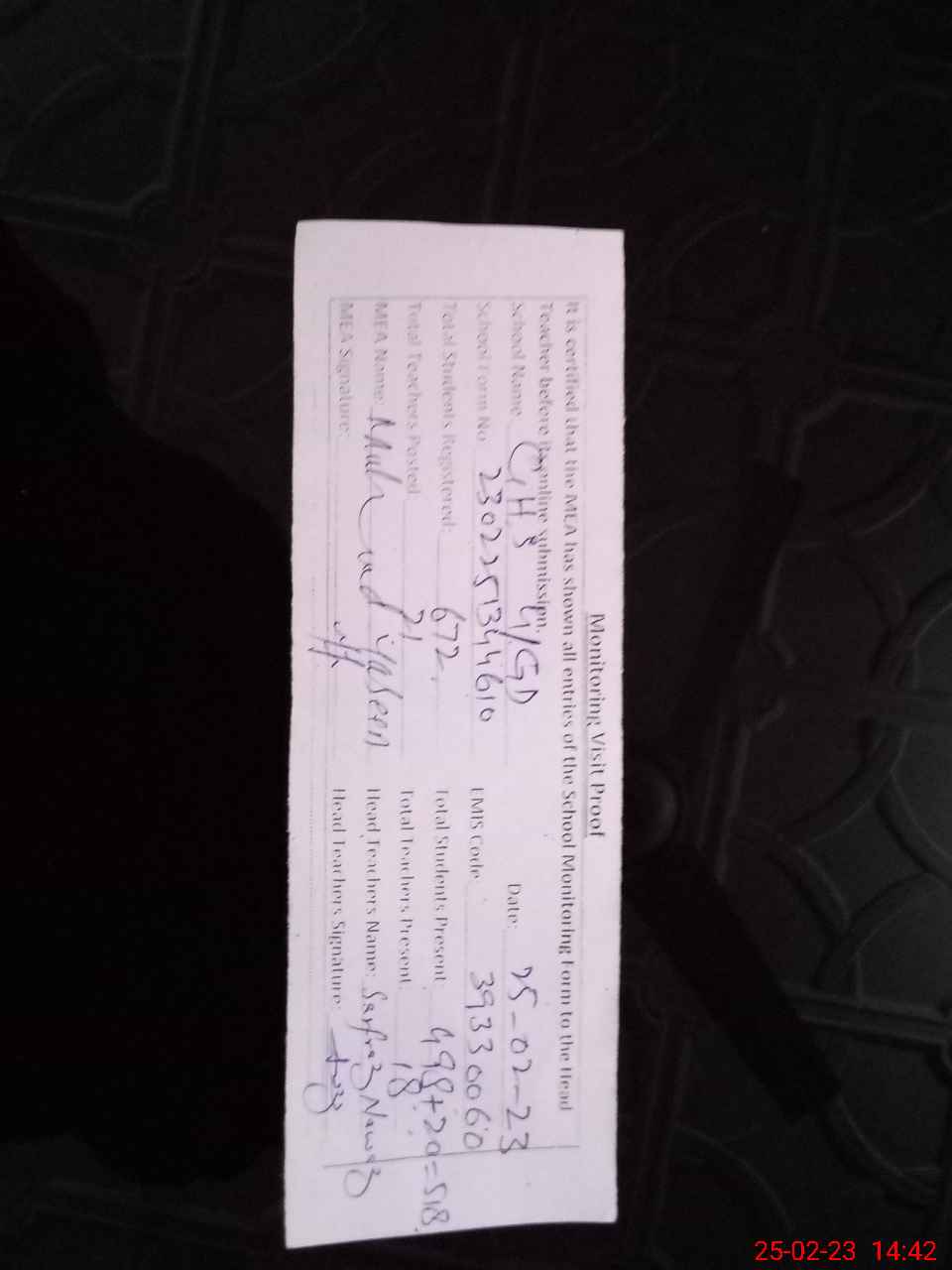 | Attendance Register | Head Teacher | MEA with School | Visit Proof |
