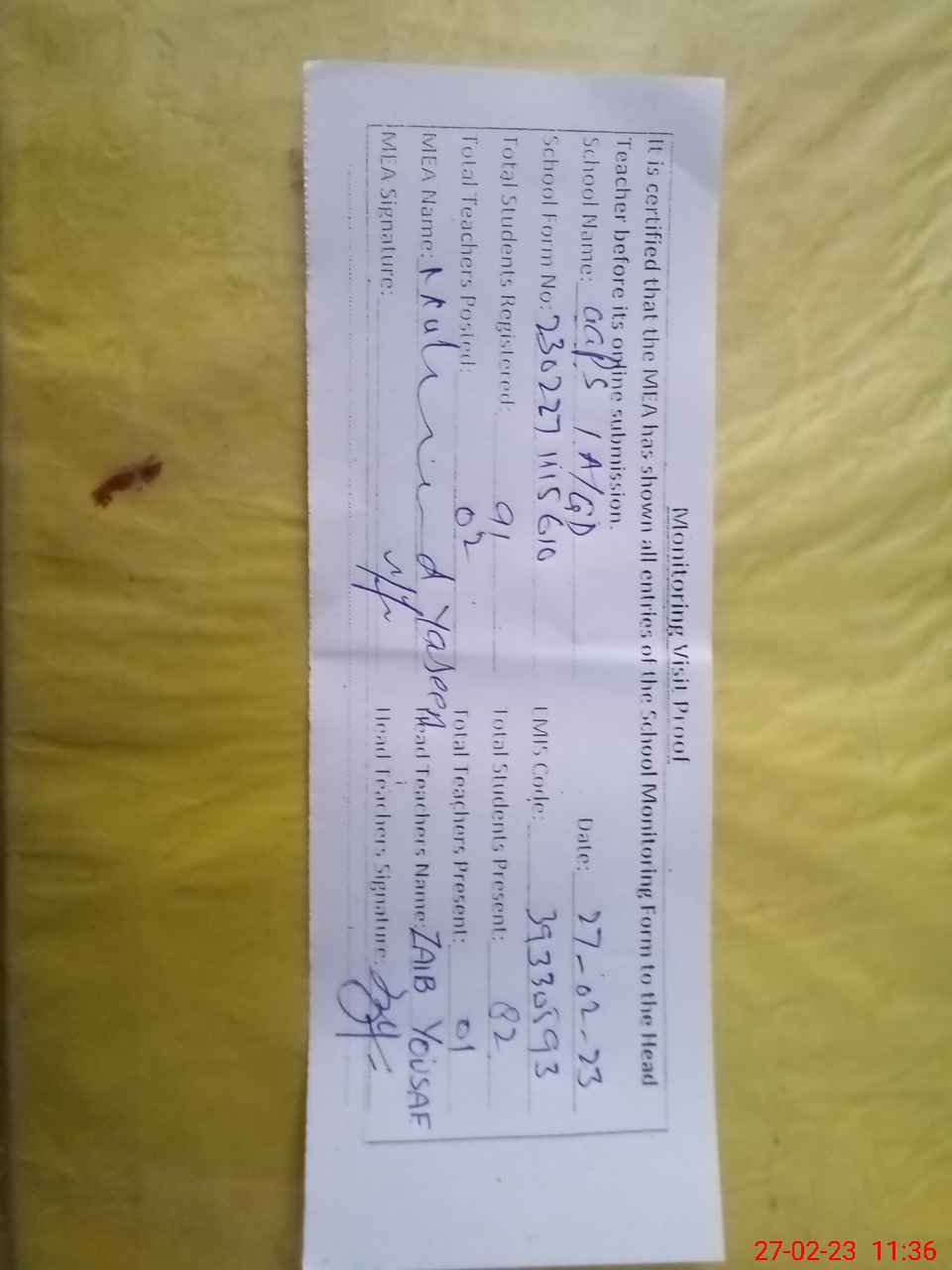 | Attendance Register | Head Teacher | MEA with School | Visit Proof |