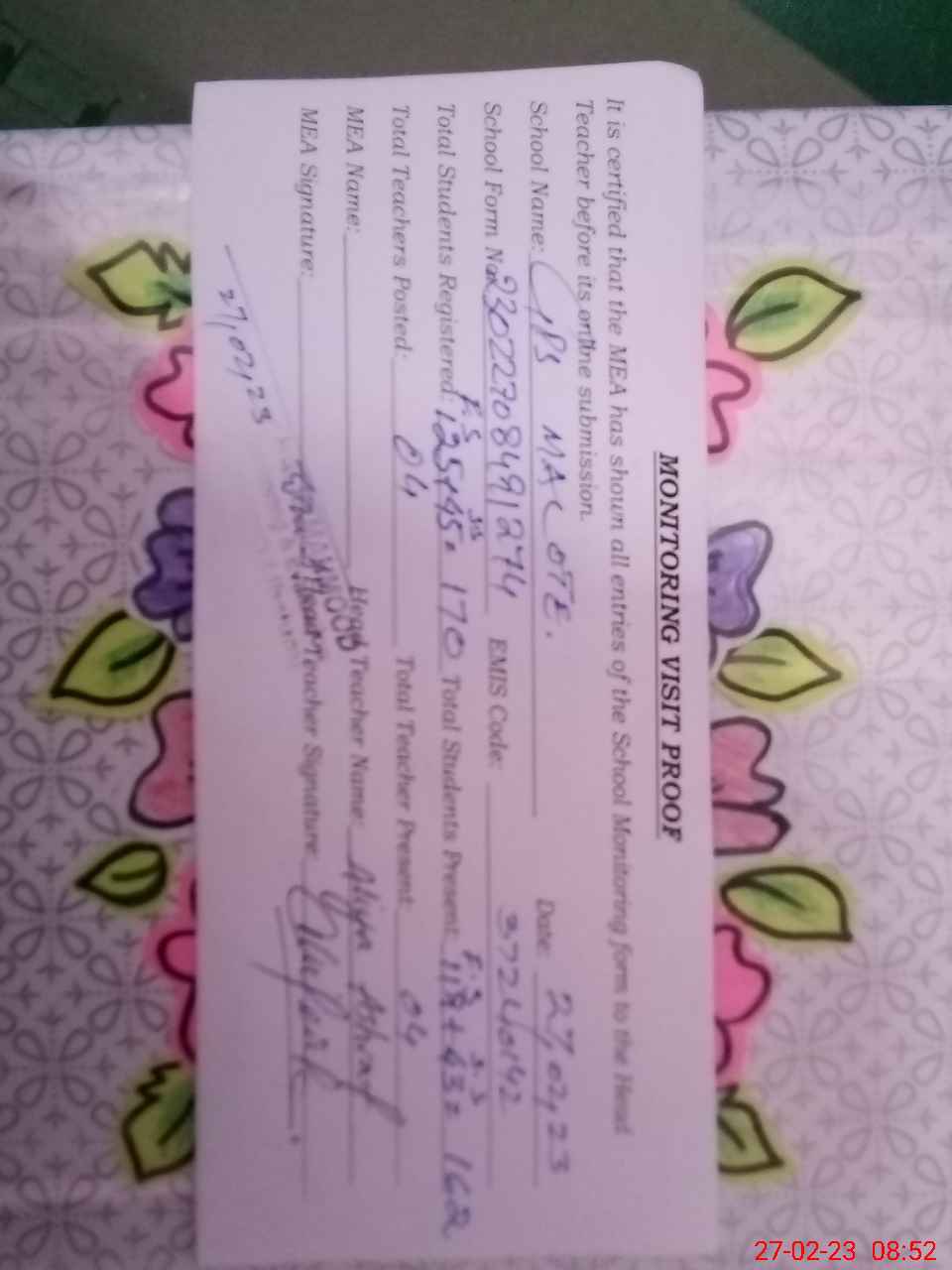 | Certified that this School was Inspected by the Undersigned MEA/DMO Today and the Information Stated Above is as Per Record. | |||||