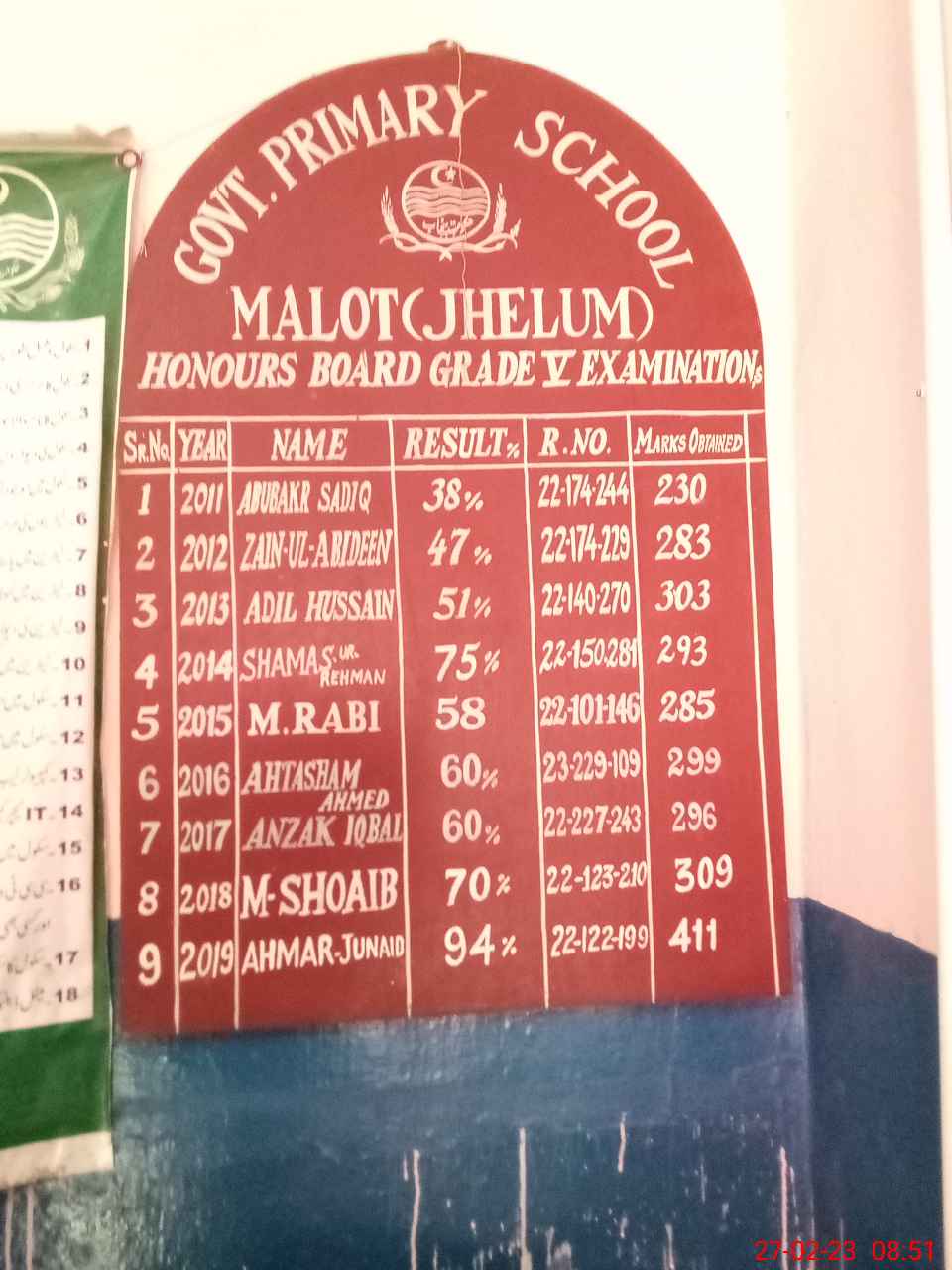 | District: JHELUM | Tehsil: DINA | Markaz: MADU KALAS - MALE | Level: Primary | |