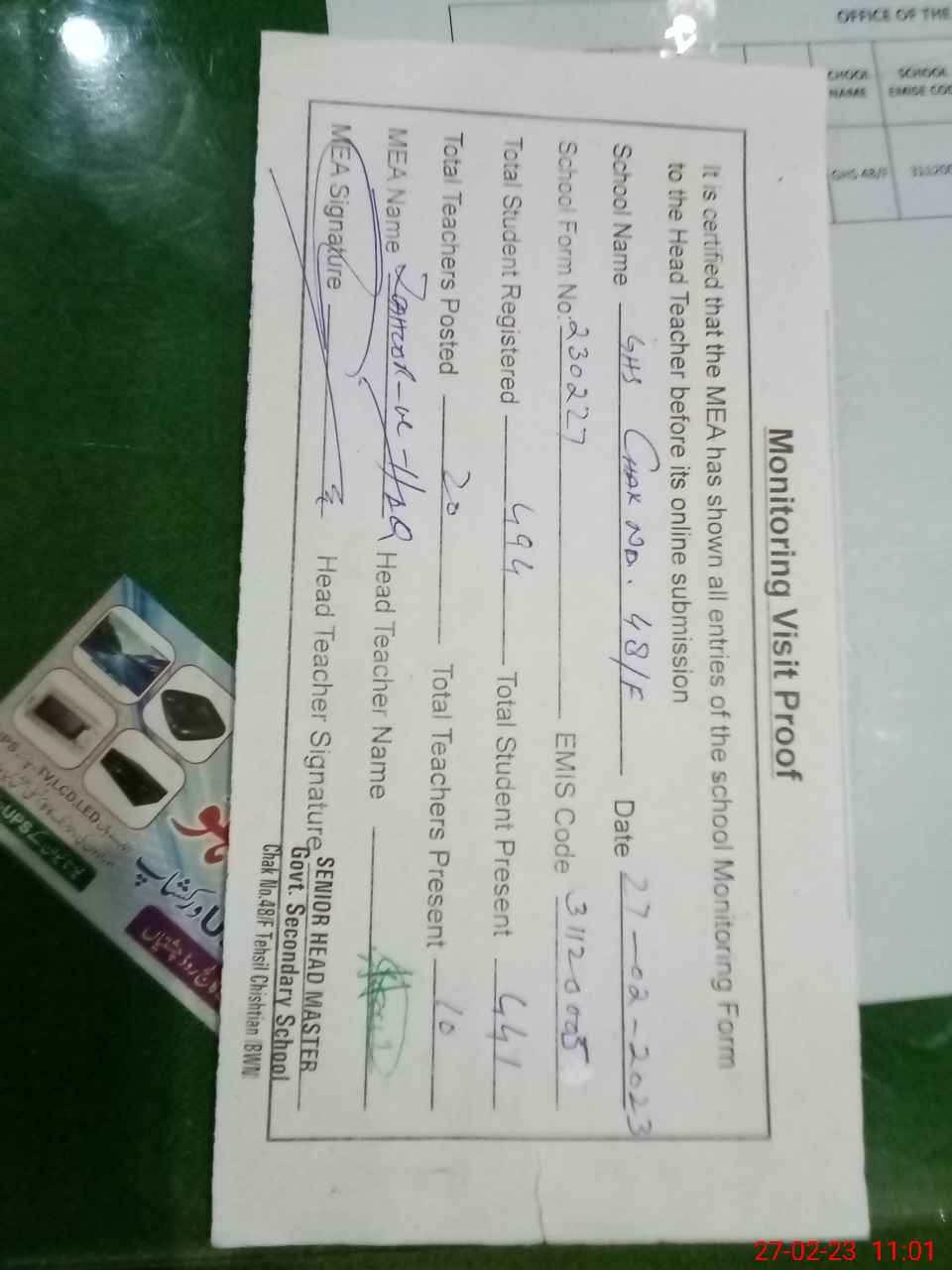 | EMIS Code: 31120005 | Name of School: GHS CHAK NO. 48/F | |||