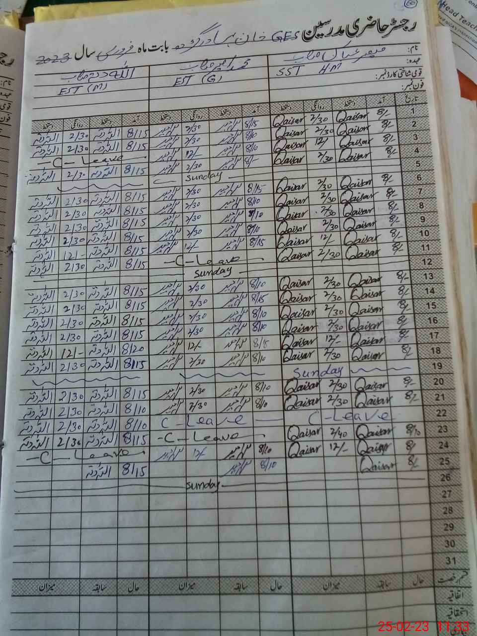 | CNIC | Full Name | Designation | R/C | Absence During Last Calender Month |