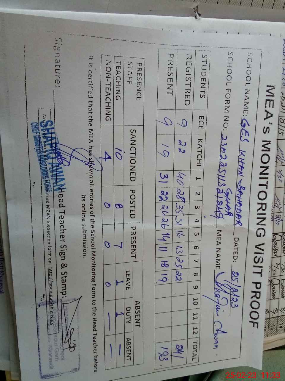 | Attendance Register | Head Teacher | MEA with School | Visit Proof |