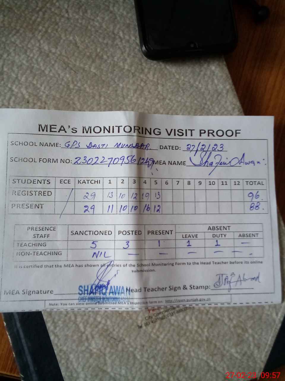 | EMIS Code: 36410325 | Name of School: GPS BASTI MUMBAR, MOUZA CHARAGH BELA, NAWAN SHEHR | |||