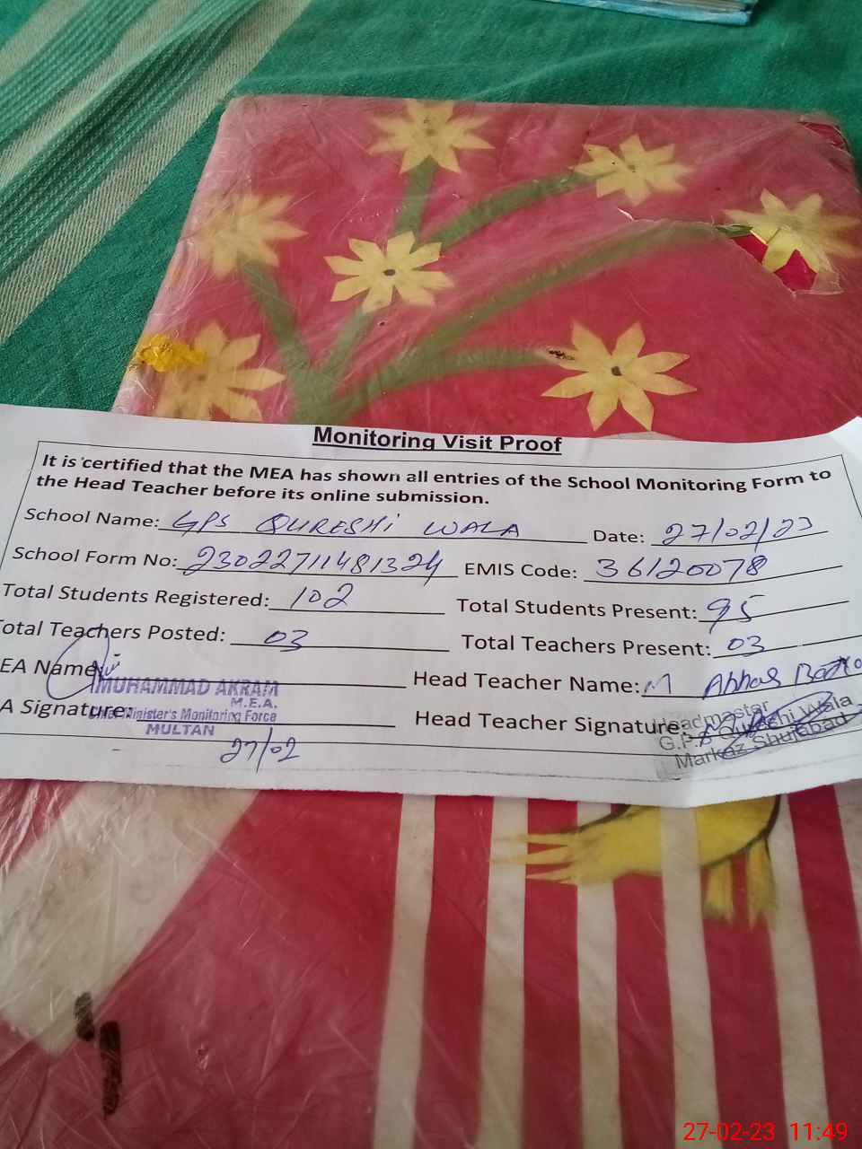 | EMIS Code: 36120078 | Name of School: GPS QURESHI WALA P.O AGHAR KHANI TEH SHUJABAD | |||