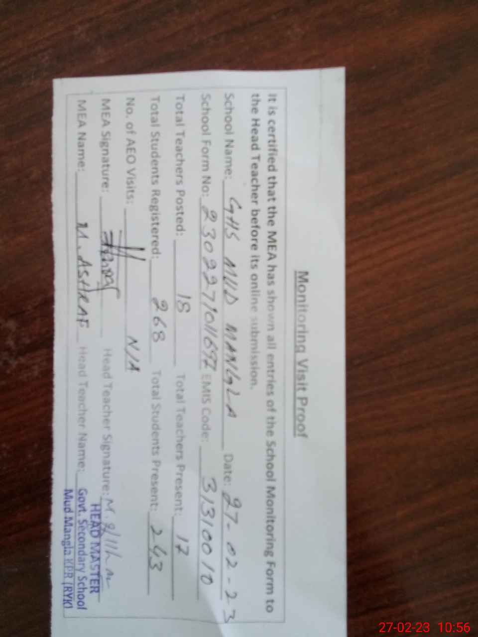 | EMIS Code: 31310010 | Name of School: GHS MUD MANGLA | |||