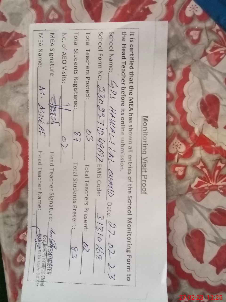| Attendance Register | Head Teacher | MEA with School | Visit Proof |