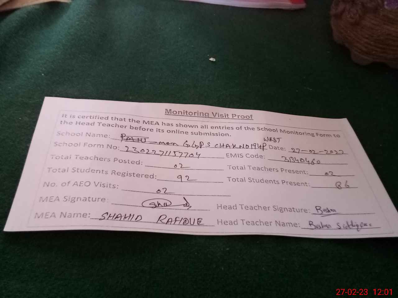 | Certified that this School was Inspected by the Undersigned MEA/DMO Today and the Information Stated Above is as Per Record. | |||||