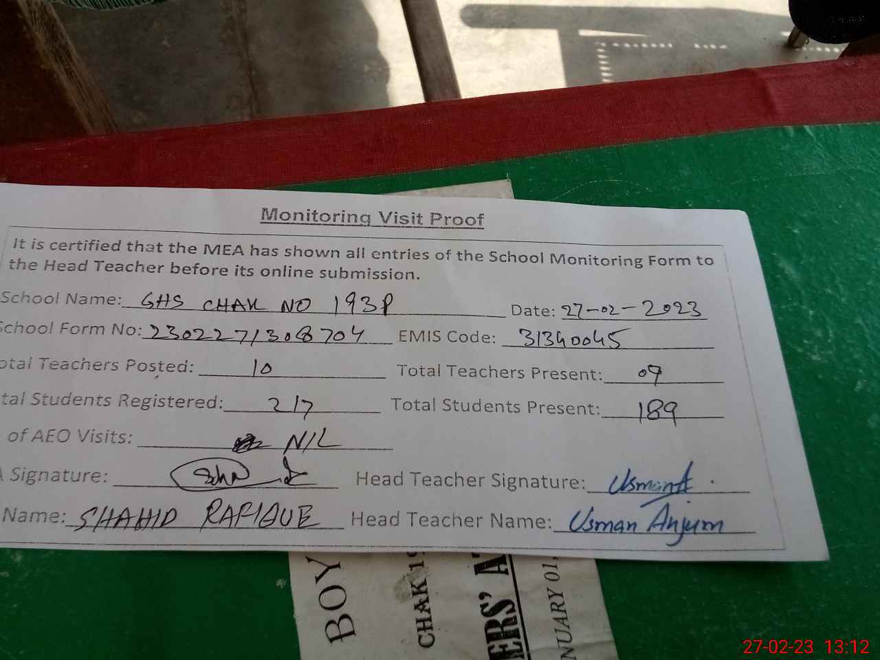 | Attendance Register | Head Teacher | MEA with School | Visit Proof |