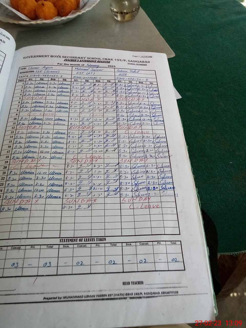 | CNIC | Full Name | Designation | R/C | Absence During Last Calender Month |