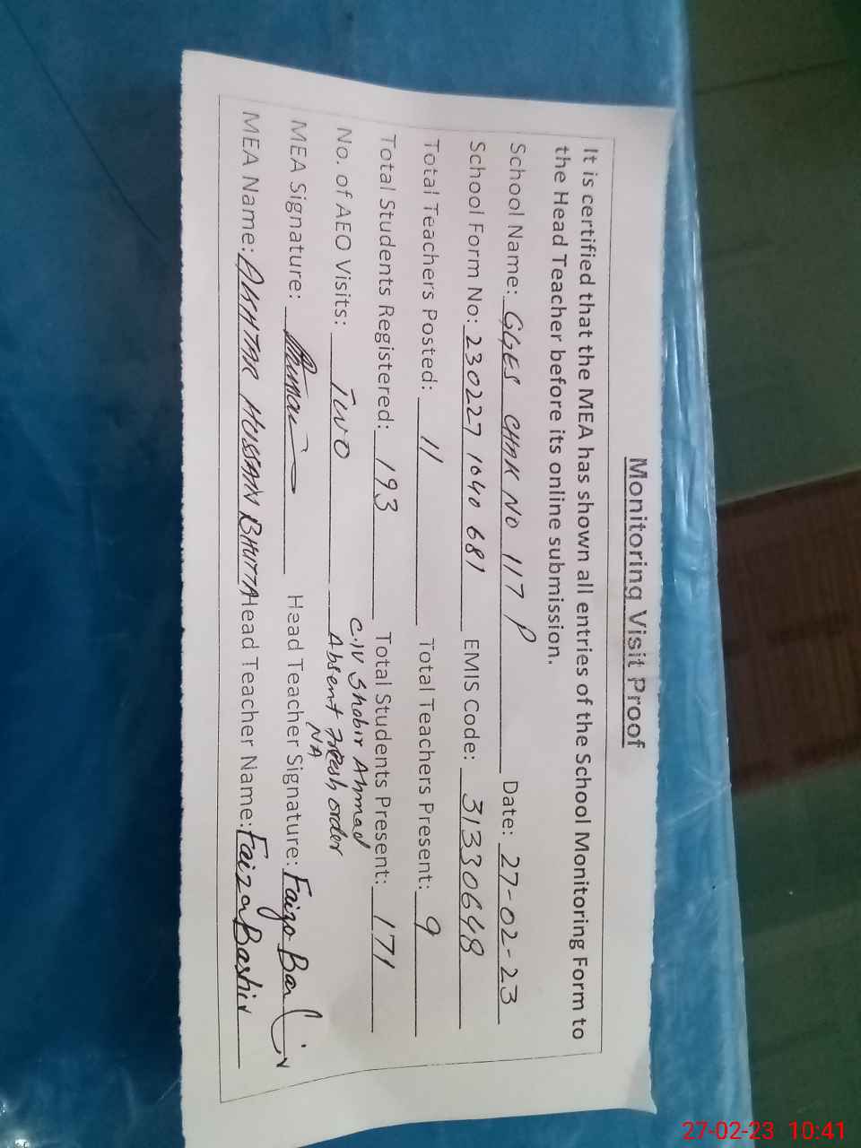 | Attendance Register | Head Teacher | MEA with School | Visit Proof |
