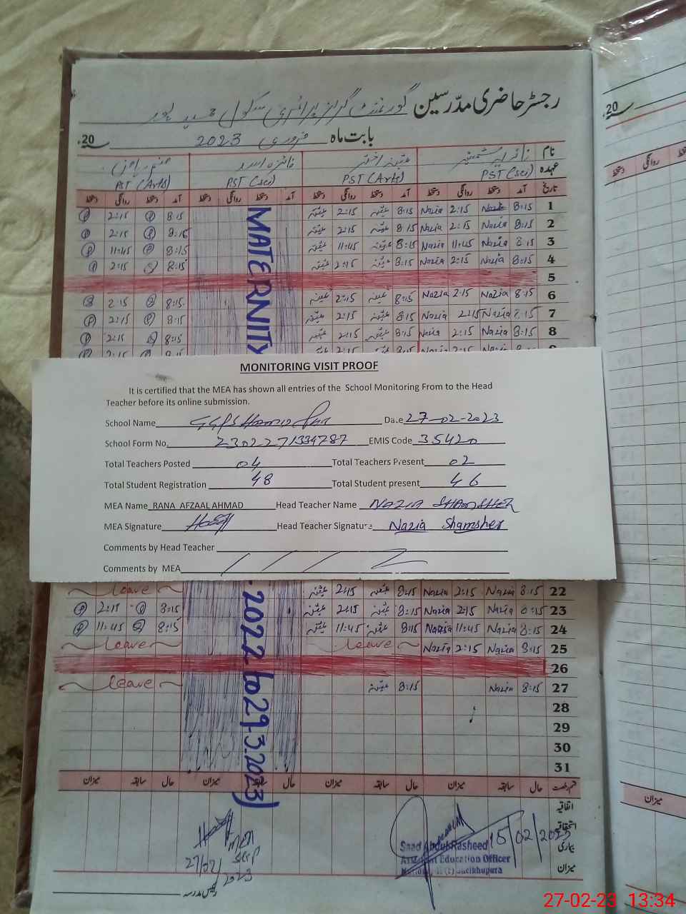 | Attendance Register | Head Teacher | MEA with School | Visit Proof |
