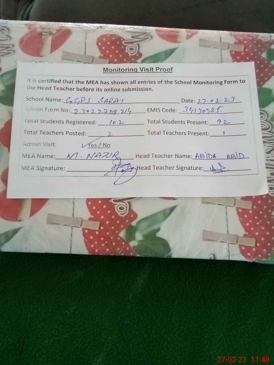 | Attendance Register | Head Teacher | MEA with School | Visit Proof |