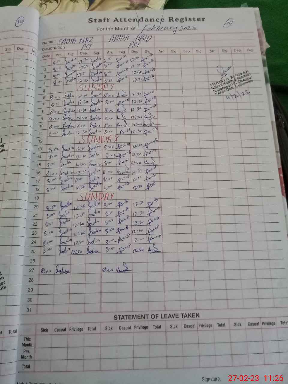| School Visited by School Health & Nutrition Supervisor (No. of Visits) | 1 | Name1: | Shaista Kousar | Name2: | |