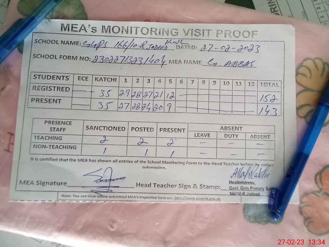 | Attendance Register | Head Teacher | MEA with School | Visit Proof |