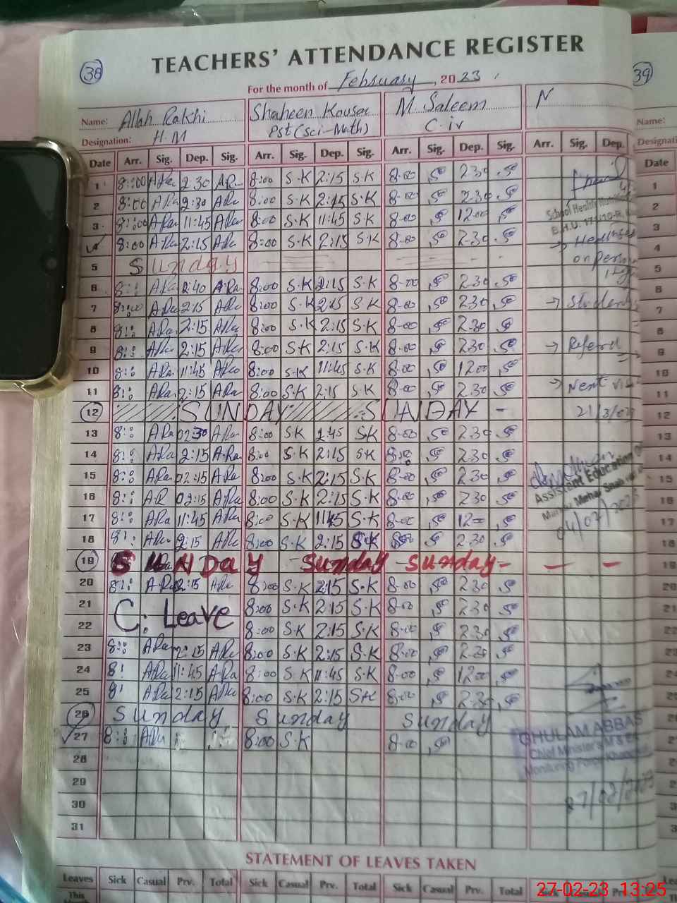 | CNIC | Full Name | Designation | R/C | Absence During Last Calender Month |