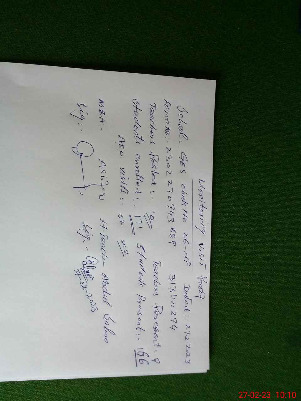 | EMIS Code: 31340294 | Name of School: GES CHAK NO. 26 NP | |||