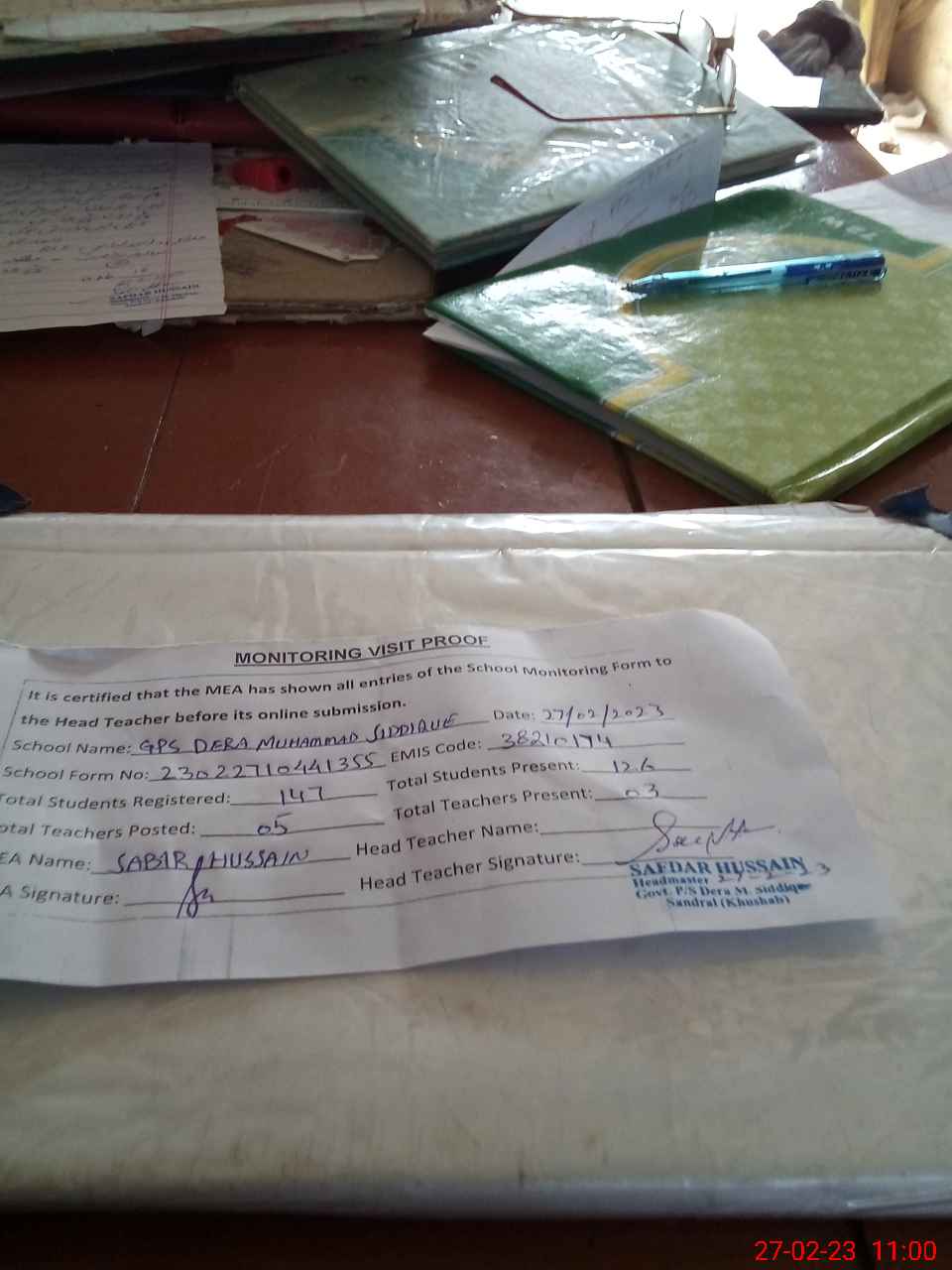 | Attendance Register | Head Teacher | MEA with School | Visit Proof |
