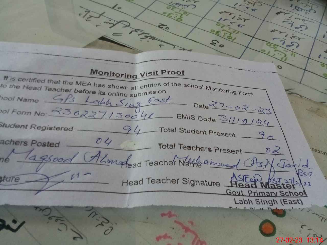 | Attendance Register | Head Teacher | MEA with School | Visit Proof |
