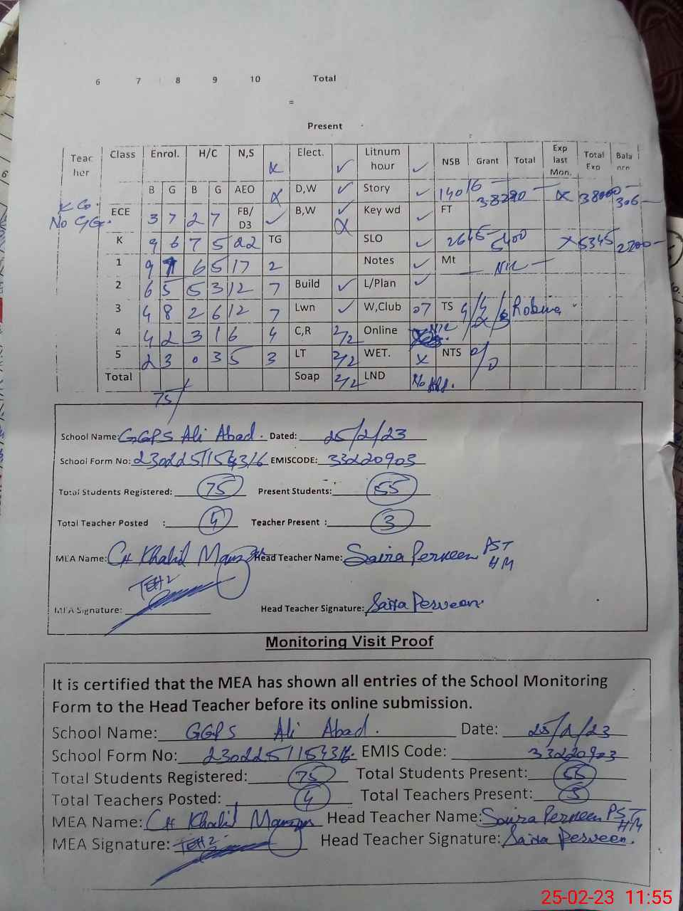 | Attendance Register | Head Teacher | MEA with School | Visit Proof |