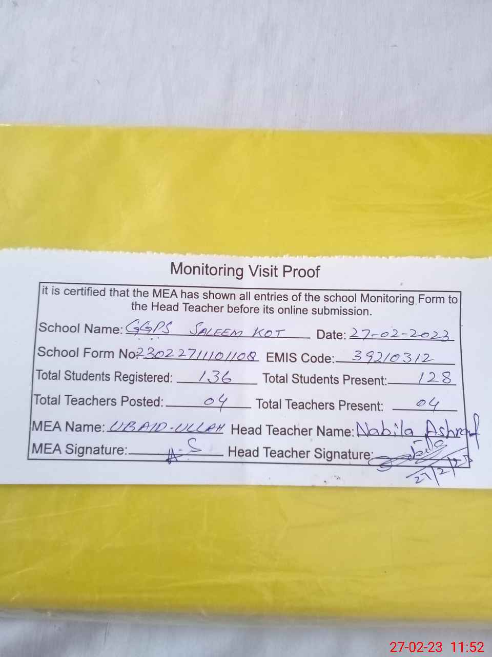 | EMIS Code: 39210312 | Name of School: GGPS SALEEM KOT | |||