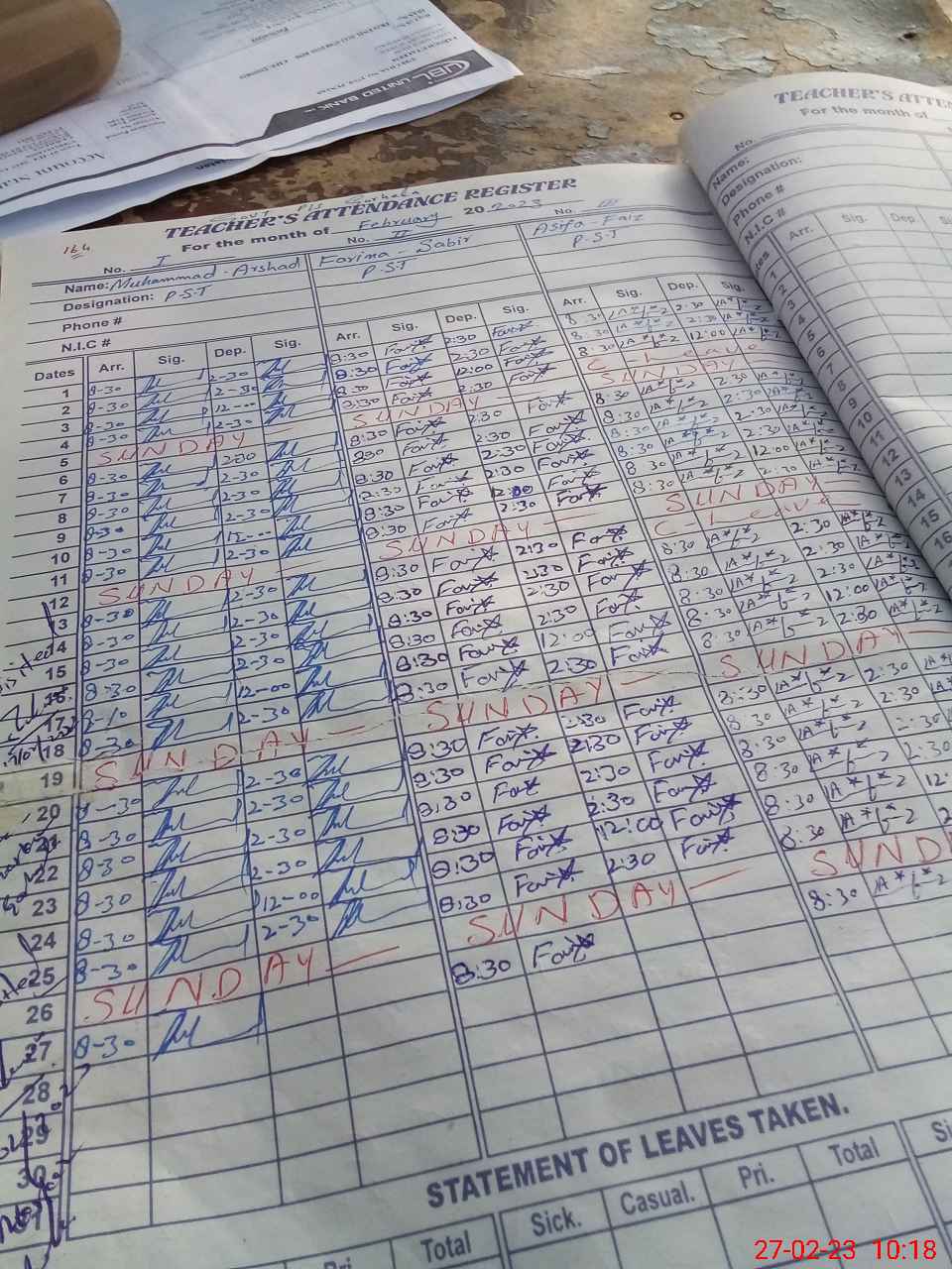 | CNIC | Full Name | Designation | R/C | Absence During Last Calender Month |