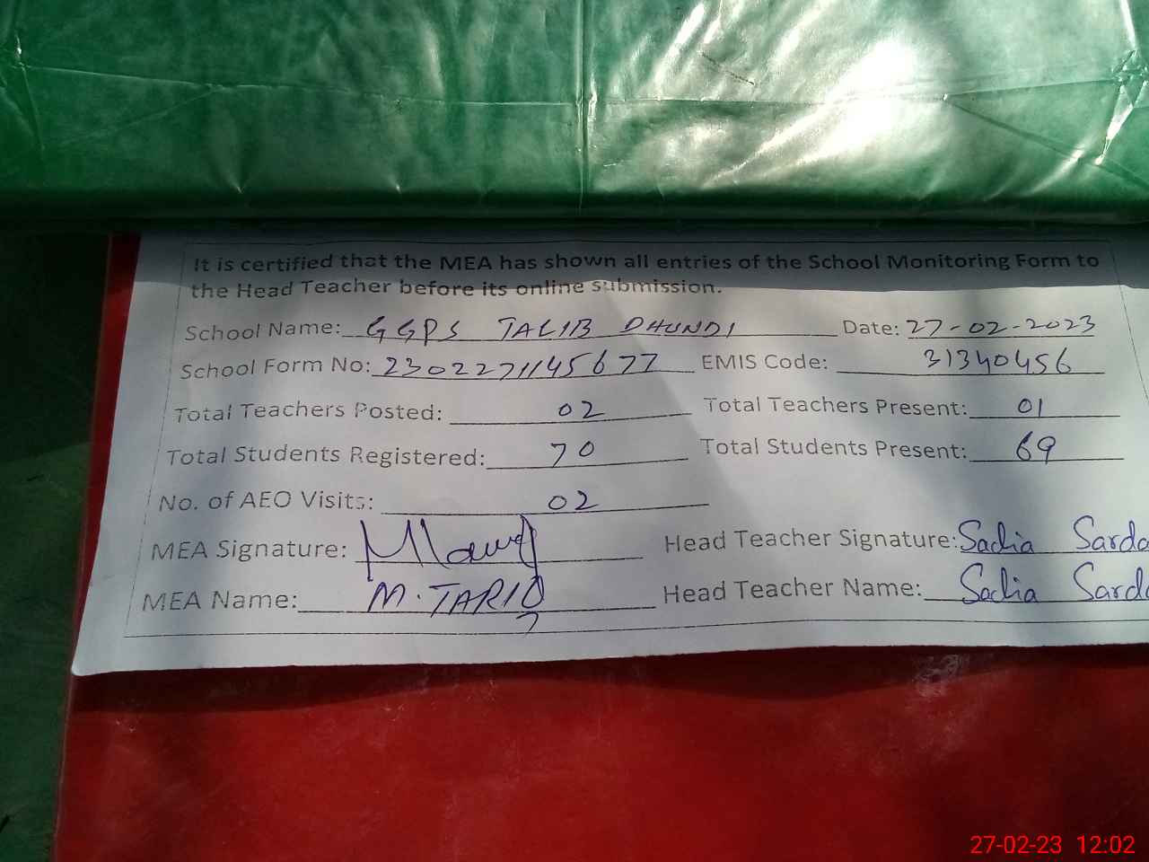 | EMIS Code: 31340456 | Name of School: GGPS TALIB DHANDI | |||