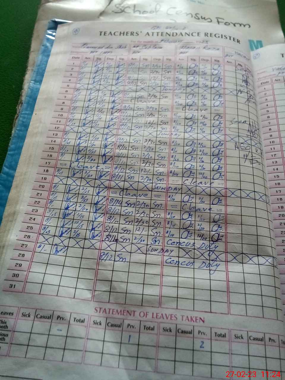 | Leave | Duty | Absent | Maternity | Medical | Ex- Pak |