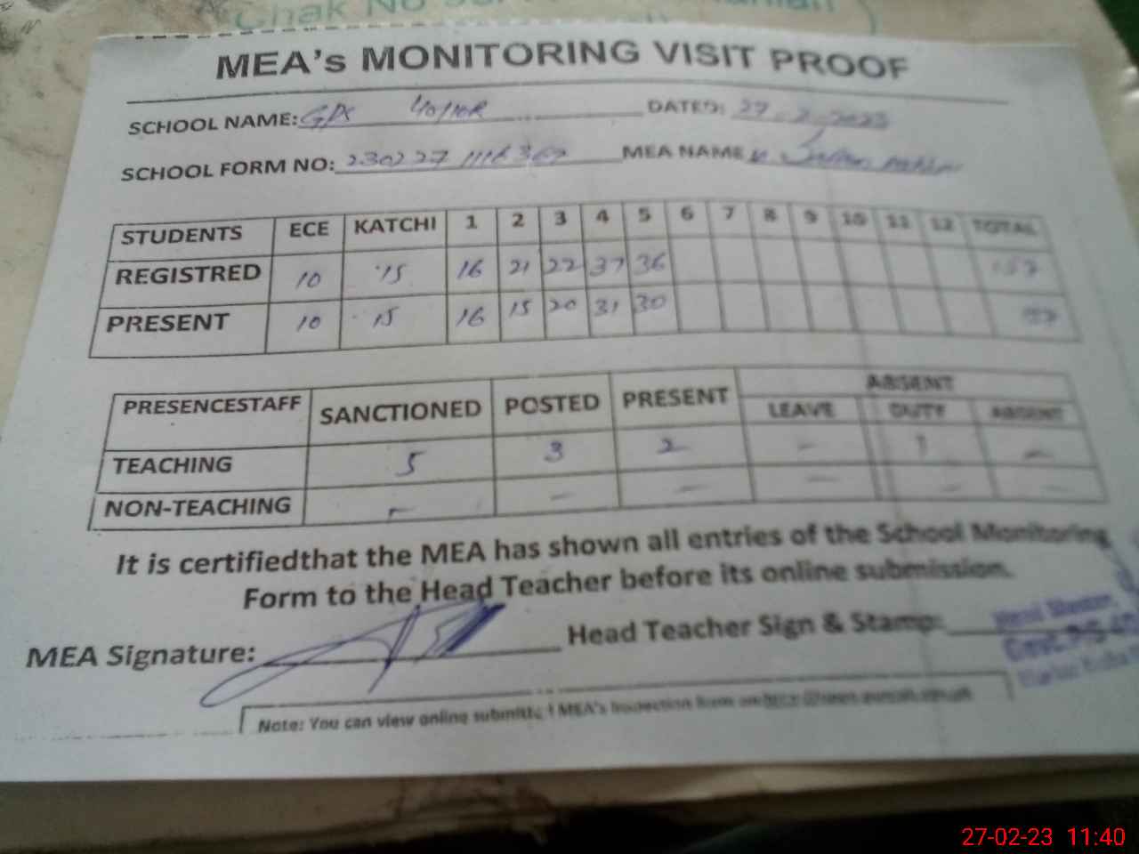 | Attendance Register | Head Teacher | MEA with School | Visit Proof |