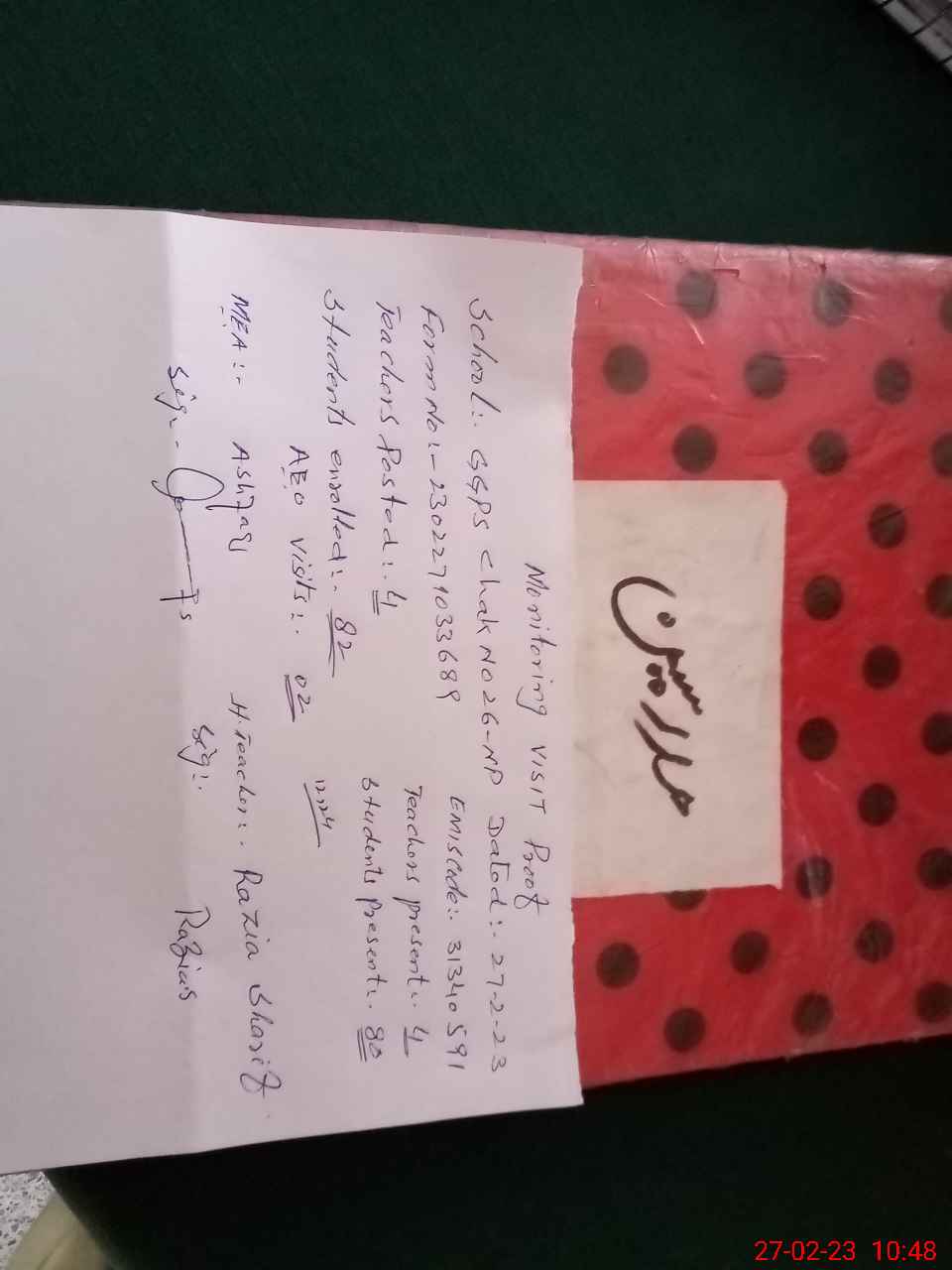| Attendance Register | Head Teacher | MEA with School | Visit Proof |