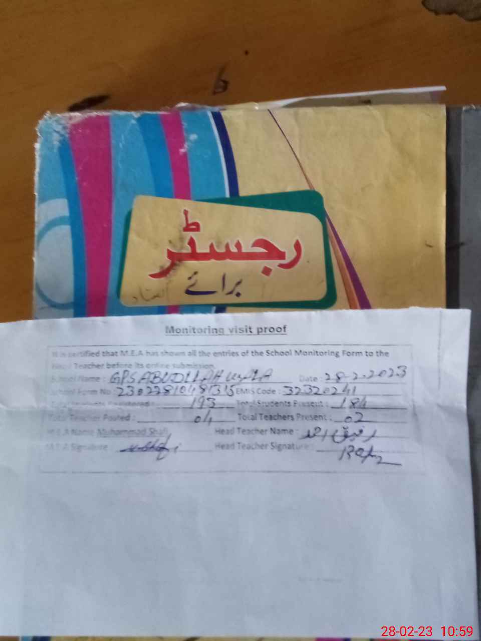 | Attendance Register | Head Teacher | MEA with School | Visit Proof |
