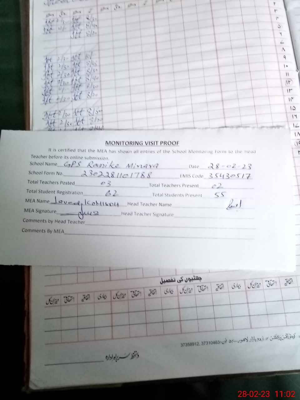 | Attendance Register | Head Teacher | MEA with School | Visit Proof |