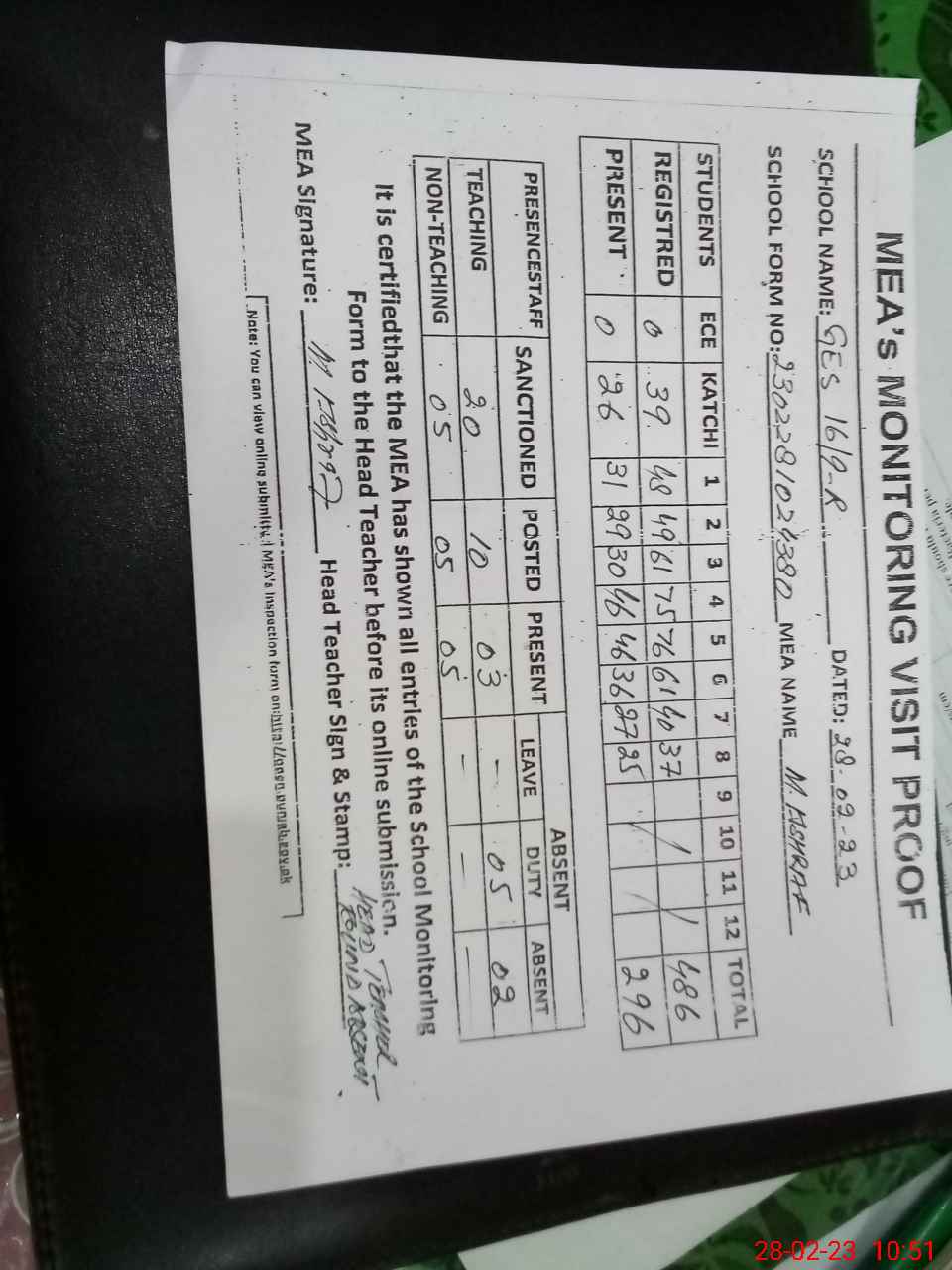 | Attendance Register | Head Teacher | MEA with School | Visit Proof |