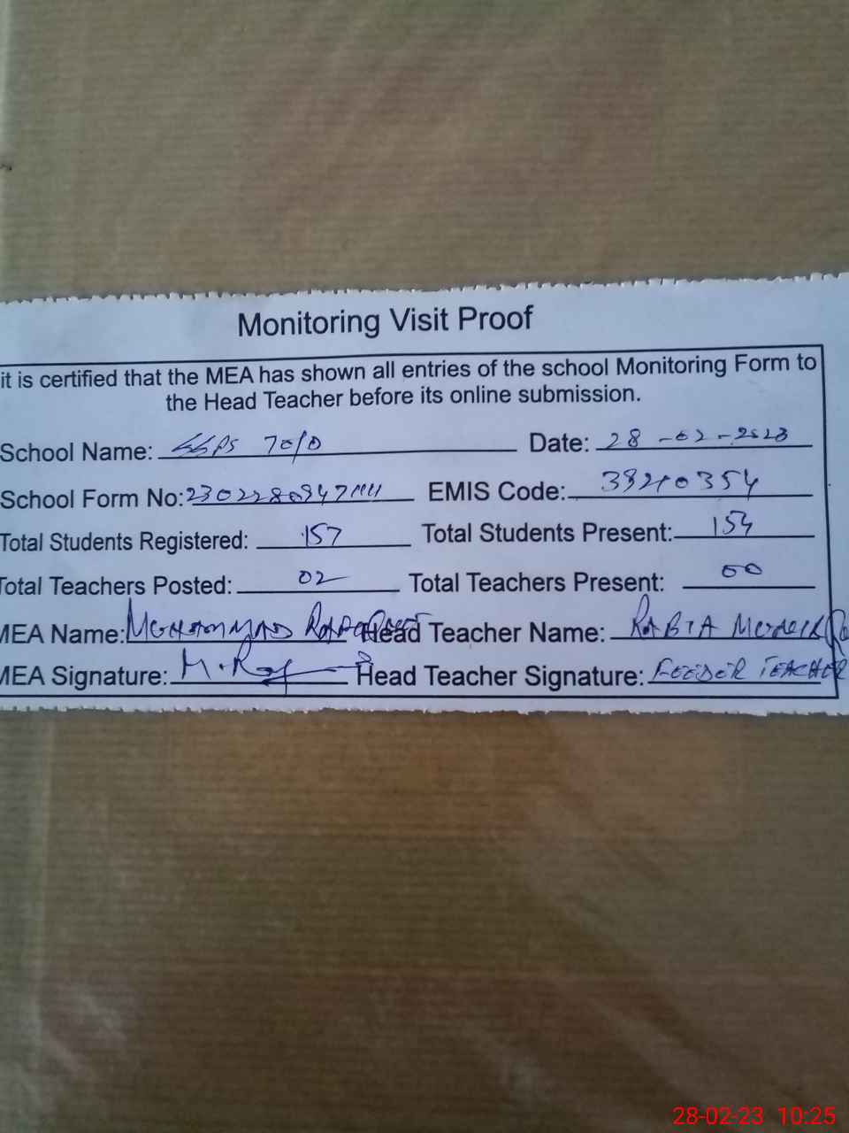 | Attendance Register | Head Teacher | MEA with School | Visit Proof |
