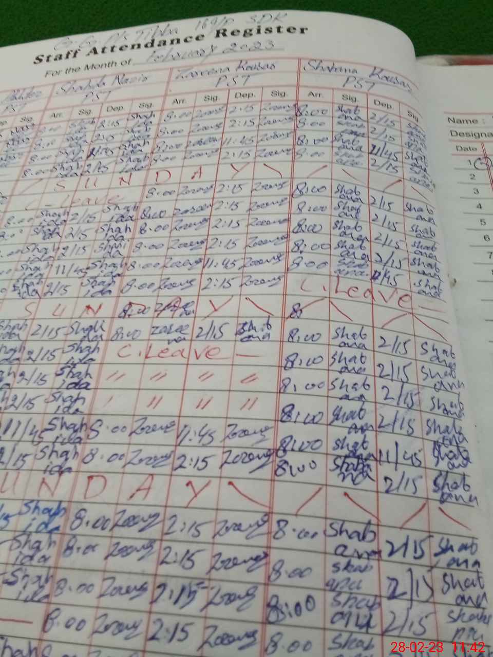 | CNIC | Full Name | Designation | R/C | Absence During Last Calender Month |