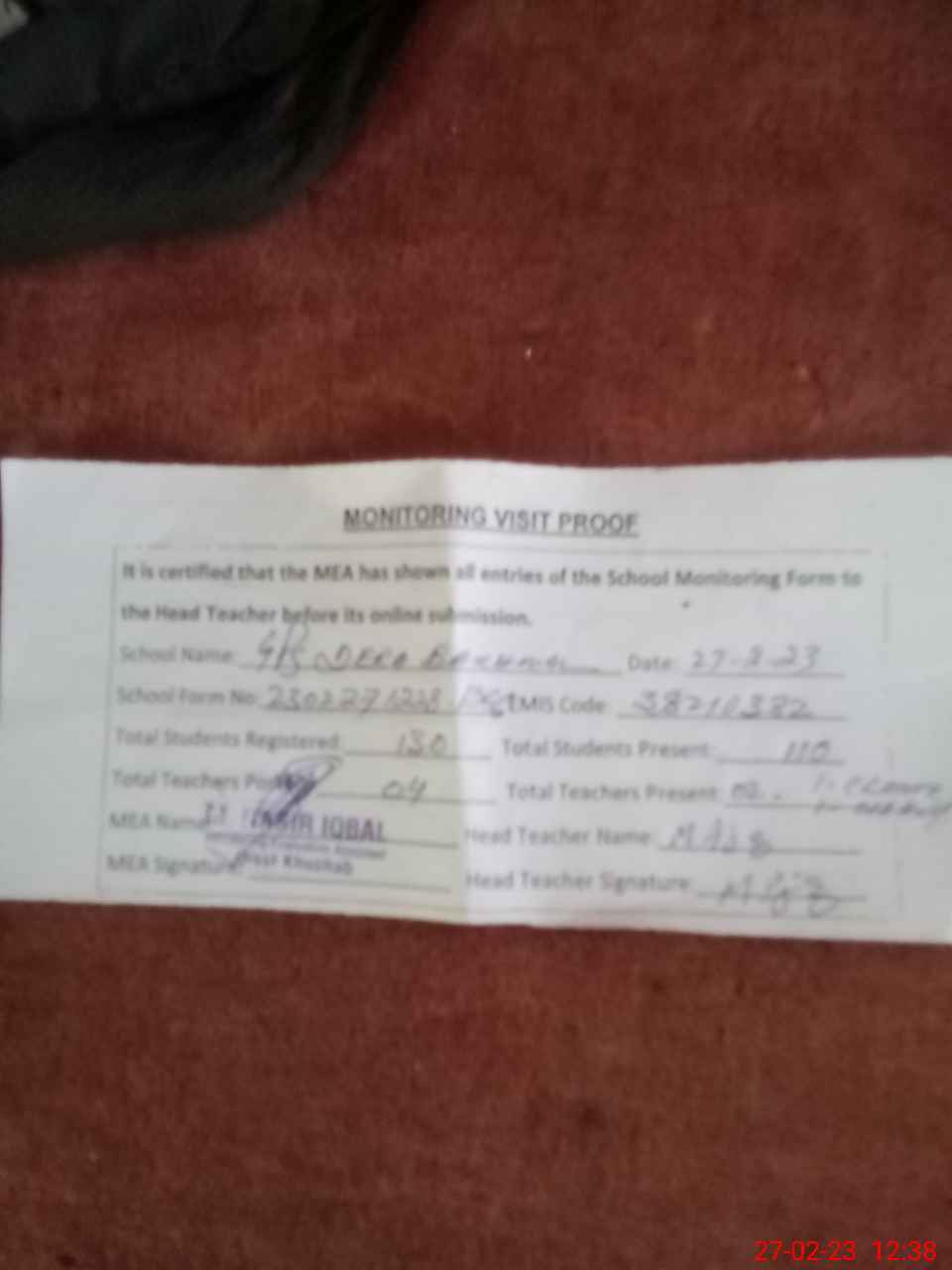 | Attendance Register | Head Teacher | MEA with School | Visit Proof |