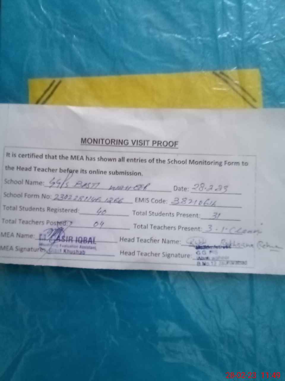 | Attendance Register | Head Teacher | MEA with School | Visit Proof |
