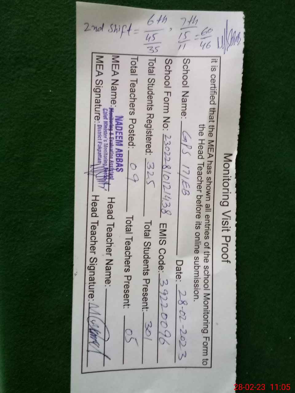| Certified that this School was Inspected by the Undersigned MEA/DMO Today and the Information Stated Above is as Per Record. | |||||