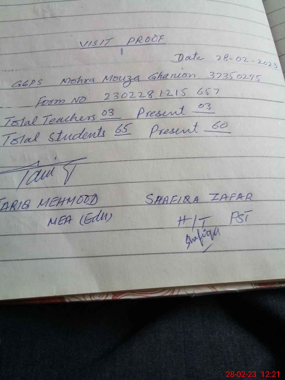 | Attendance Register | Head Teacher | MEA with School | Visit Proof |
