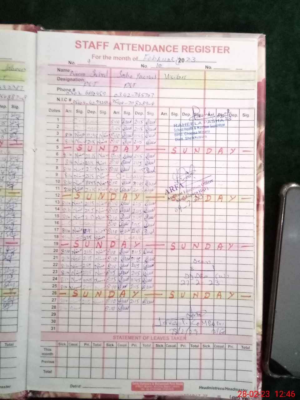 | CNIC | Full Name | Designation | R/C | Absence During Last Calender Month |