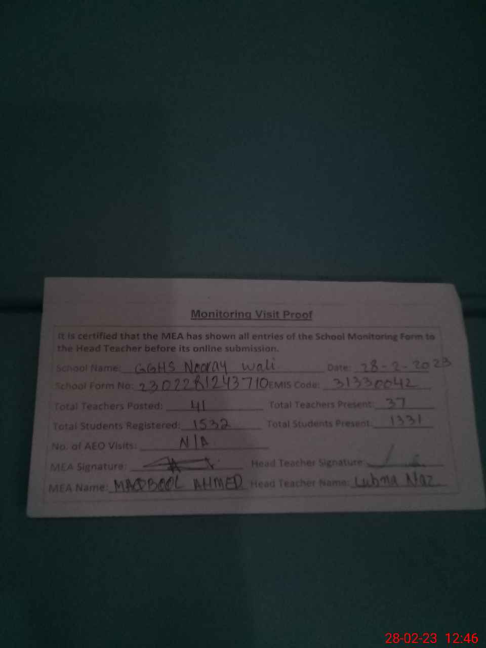 | Attendance Register | Head Teacher | MEA with School | Visit Proof |
