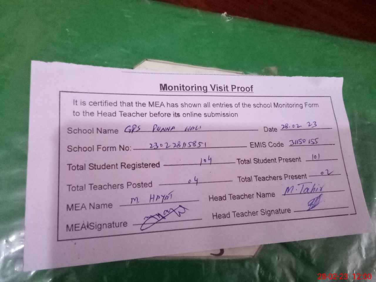 | Attendance Register | Head Teacher | MEA with School | Visit Proof |