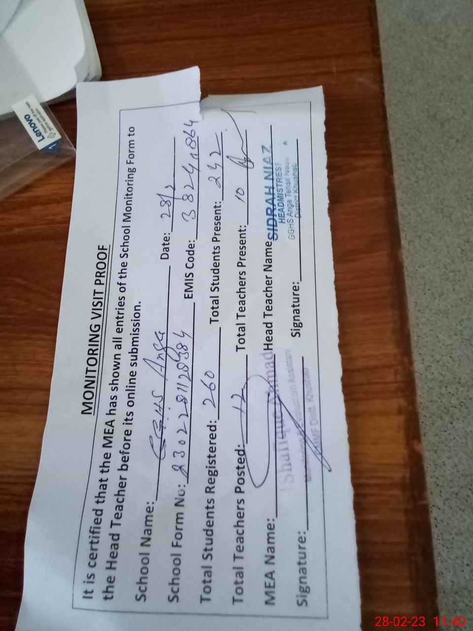 | Attendance Register | Head Teacher | MEA with School | Visit Proof |
