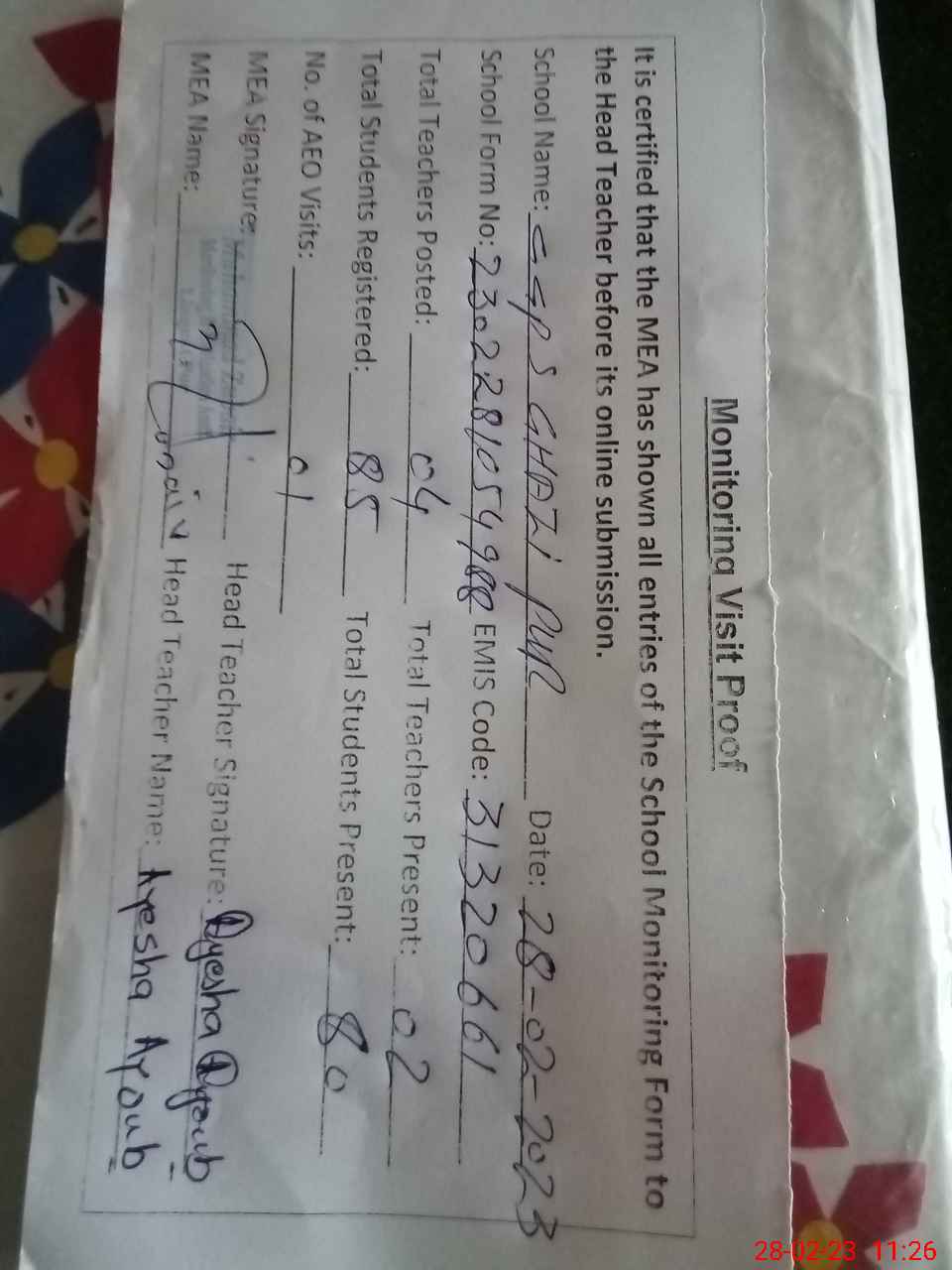 | EMIS Code: 31320661 | Name of School: GGPS GHAZI PUR | |||